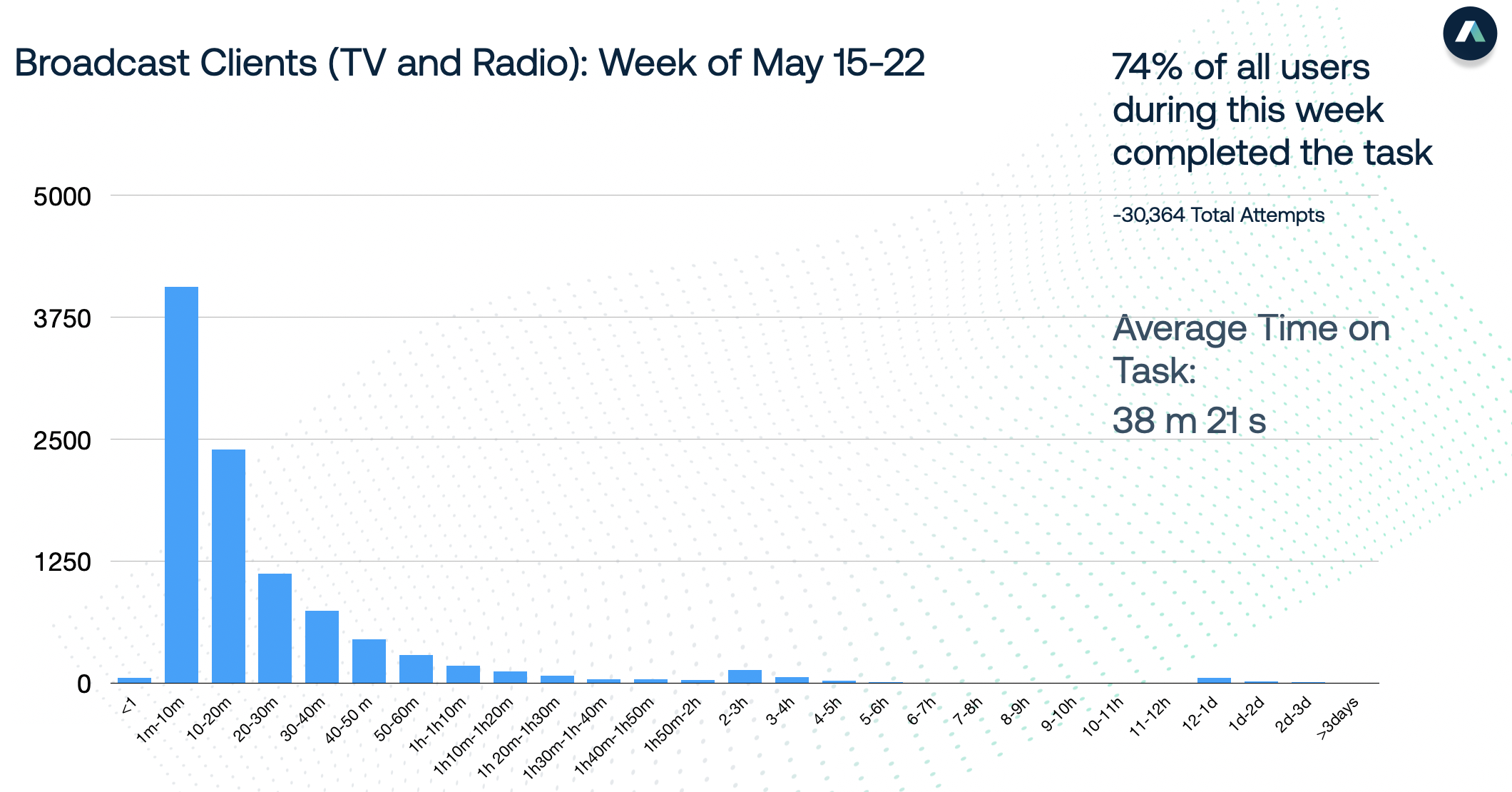For our Broadcast clients, an even higher number of articles were published in under 10 minutes. In contrast to our Newspaper clients, it is likely that some of this truly is clients starting and completing work within Composer—Broadcast clients often have routine publications online that are simplified versions of what has been broadcast. These can be turned around quickly and are often published online without review. However, these numbers suggest that we do have Broadcast clients who write, edit, and in some cases go through the review process outside of Composer, and then cutting and pasting finished work into the CMS. The Composer redesign will significantly reduce points of friction that keep current users from doing this work within the system. When we benchmark again after the redesign we expect these numbers to go down. This is an excellent example of how benchmarking can be used to demonstrate ROI in design research.